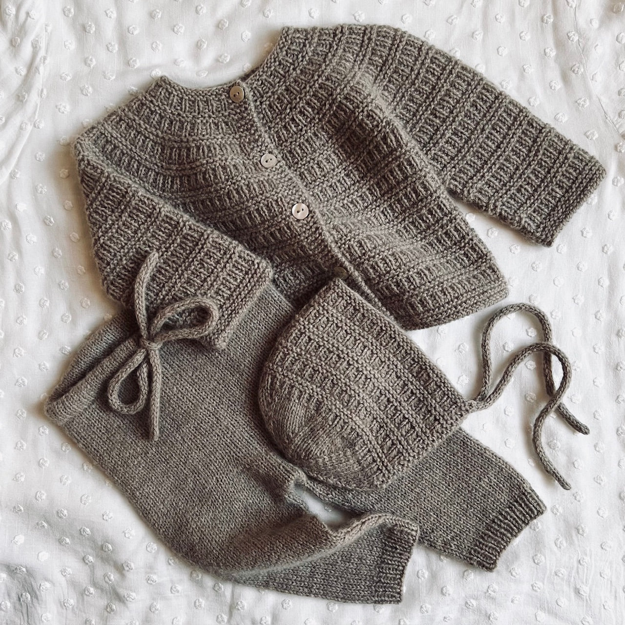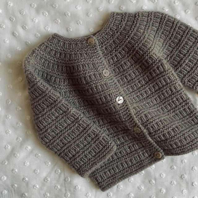 Det perfekte første settet til en liten skatt. Strikket i den aller letteste og mykeste merinoull. Sorgenfri hentesett består av Sorgenfri jakke, Elisenberg bukse og Sorgenfri babylue.