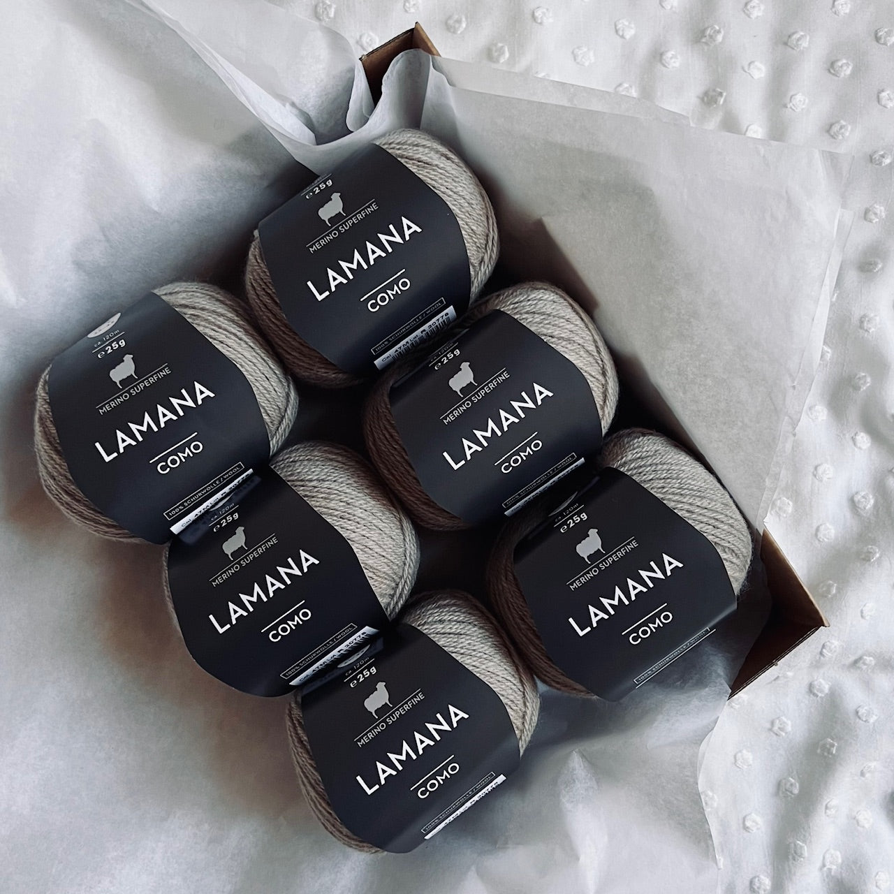 -6 nøster Como fra Lamana. Garnet rekker til et fullt sett i størrelse 0-3 mnd.