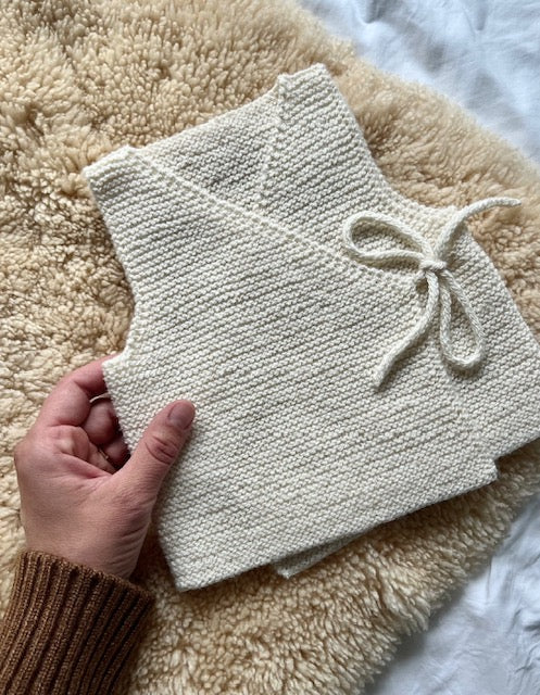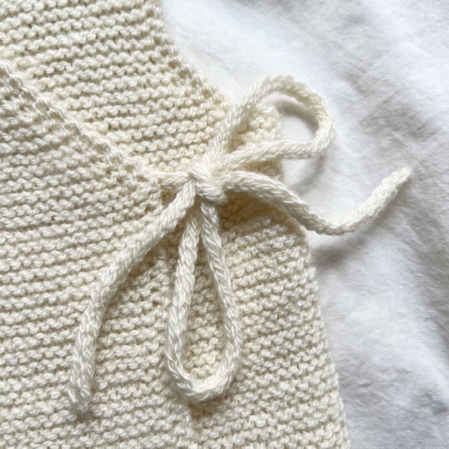 Fagerborg omslagsvest strikkes ovenfra og ned, frem og tilbake i rillestrikk på en lang rundpinne. Vesten lukkes med i-cord knytesnorer.